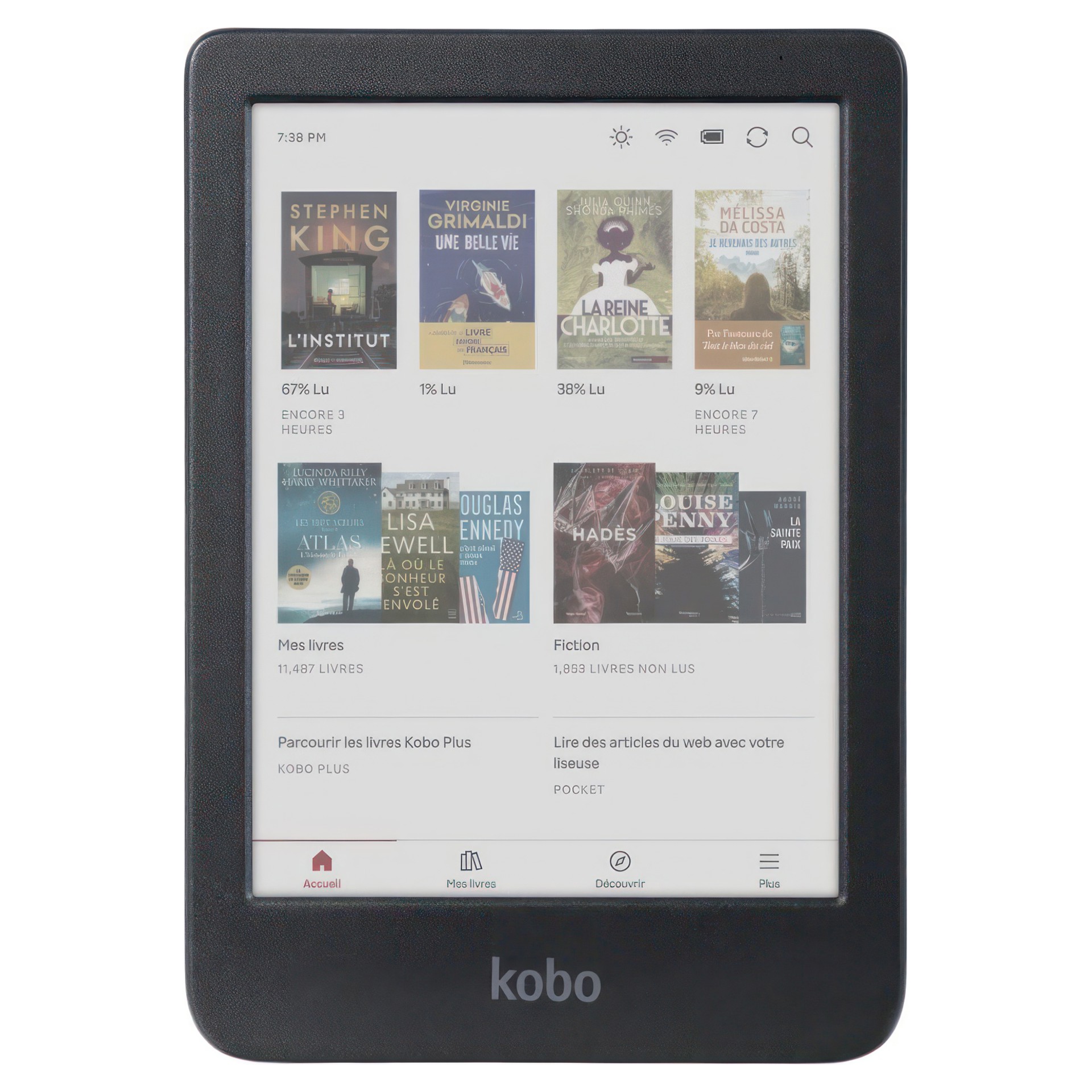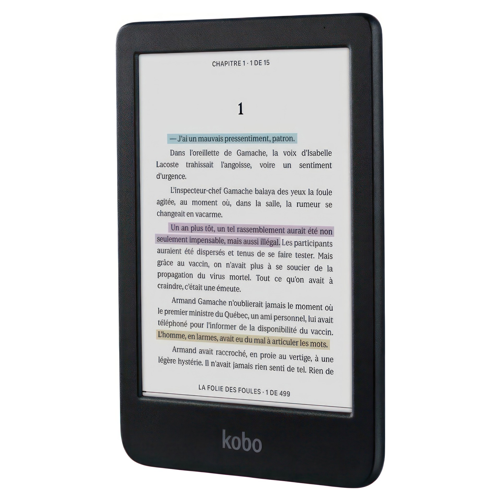 Désormais, avec plusieurs couleurs disponibles d’une simple pression du doigt, vous pouvez surligner vos livres électroniques comme des livres imprimés. Ajoutez, effacez ou modifiez les couleurs au fur et à mesure, et visualisez facilement tous vos surlignages par chapitre en un coup d’œil; vos citations du club de lecture n’ont jamais été aussi faciles à trouver!
