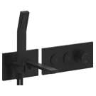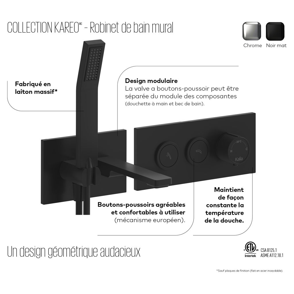 Robinet de bain mural au design novateur modulaire: la valve a boutons-poussoirs peut être séparée du module des composantes (douchette à main et bec de bain) pour maximiser le confort et la commodité.